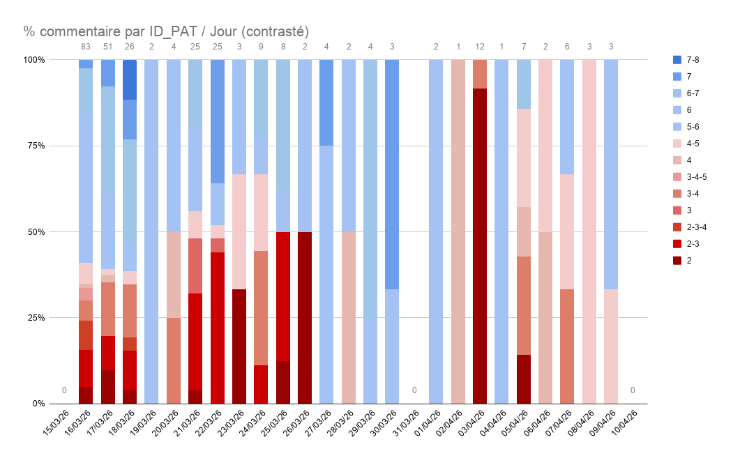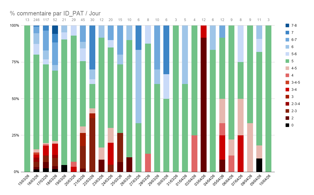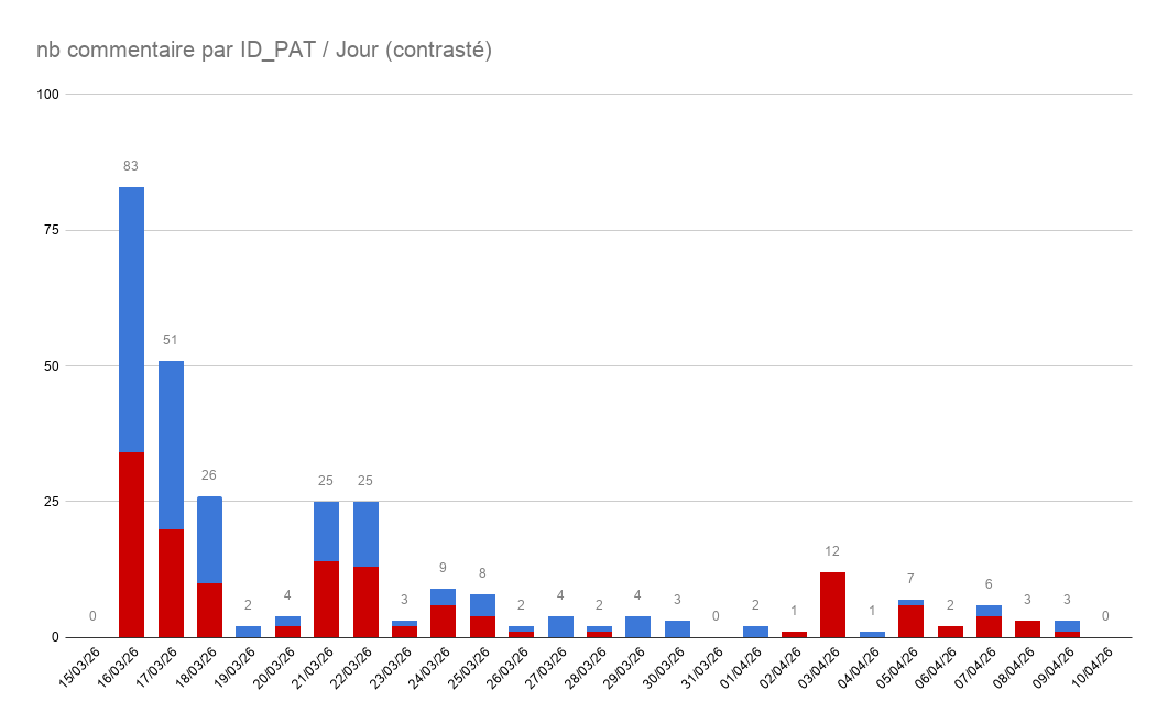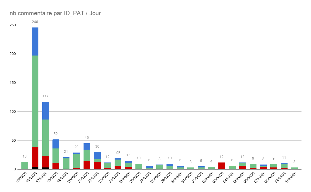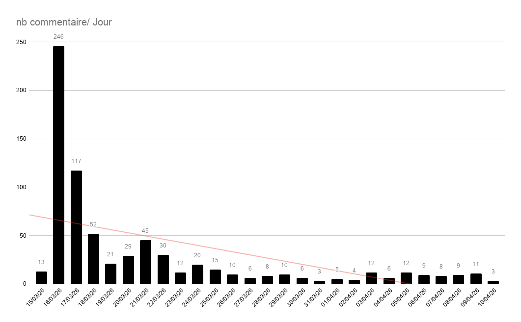 50 % des commentaires sur la publication ont été publiés dans les trois premiers jours de vie de la publication (376/722)58.7% (424/722) des commentaires valident ou s'alignent sur la position de B.S. 18.8 % (136/122) sont plus pro-patriarcaux 21 % (152/722) sont plus anti-patriarcaux