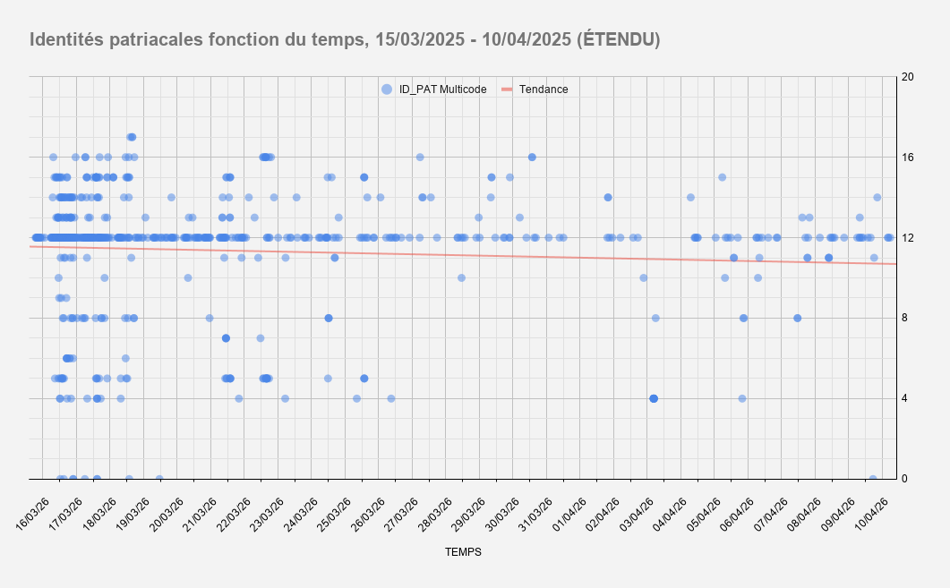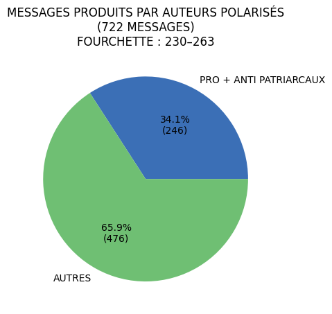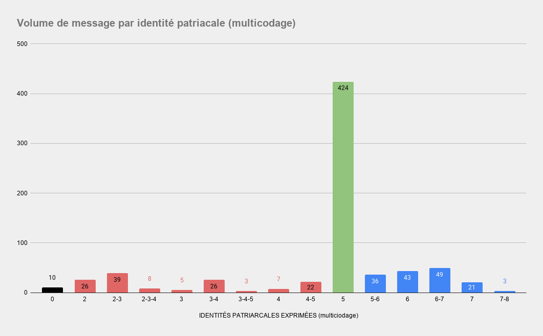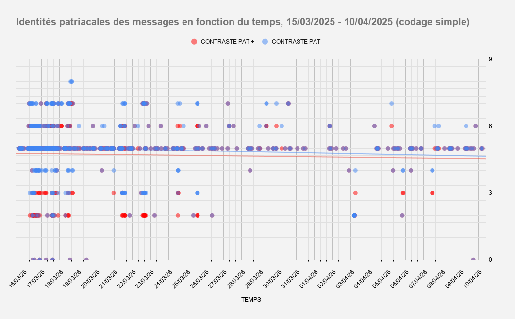 Au fil du temps, la part de commentaires pro-patriarcaux prend le pas sur les commentaires anti-patriarcaux. Si on augmente le contraste en retirant du pool les commentaires hors-sujet et les égalitaristes libéraux, on remarque qu'avec le temps, la polarité tend vers les identités pro-patriarcales qui dominent de plus en plus le débat en volume de commentaires publiés.En dépit d'une représentation constante des identités libérales, on remarque avec le temps, la disparition des identités anti-patriarcales (bleu) dans les commentaires et le maintien des pro-patriarcales (rouge)Le phénomène est plus visible quand on retire les hors-sujet et les libéraux de la représentation graphique.Sur cette représentation où chaque point est un commentaire publié situé en fonction de l'identité patriarcale exprimée, on remarque une forte densité de messages égalitaristes libéraux qui s'amenuise avec le temps et un amenuisement rapide de la diversité des positions au fil du temps. La tendance globale des identités exprimés tend sensiblement vers les postures pro-patriarcales.Sur cette représentation reprenant le même principe graphique mais accentuant les polarités des identités pro- et anti-patriarcales on remarque que la tendance persiste, quand bien même on réduit le poids des identités pro-patriarcales dans l'analyse. 3/4 des commentaires surviennent hors microfilsPlus de 90% des auteurs n'ont produit qu'un seul commentaire.28% des commentaires sont commis par environ 10% des AuteursLes auteurs les plus polarisés sur l'échelle des identités patriarcales représentent environ 10% des identités représentées.