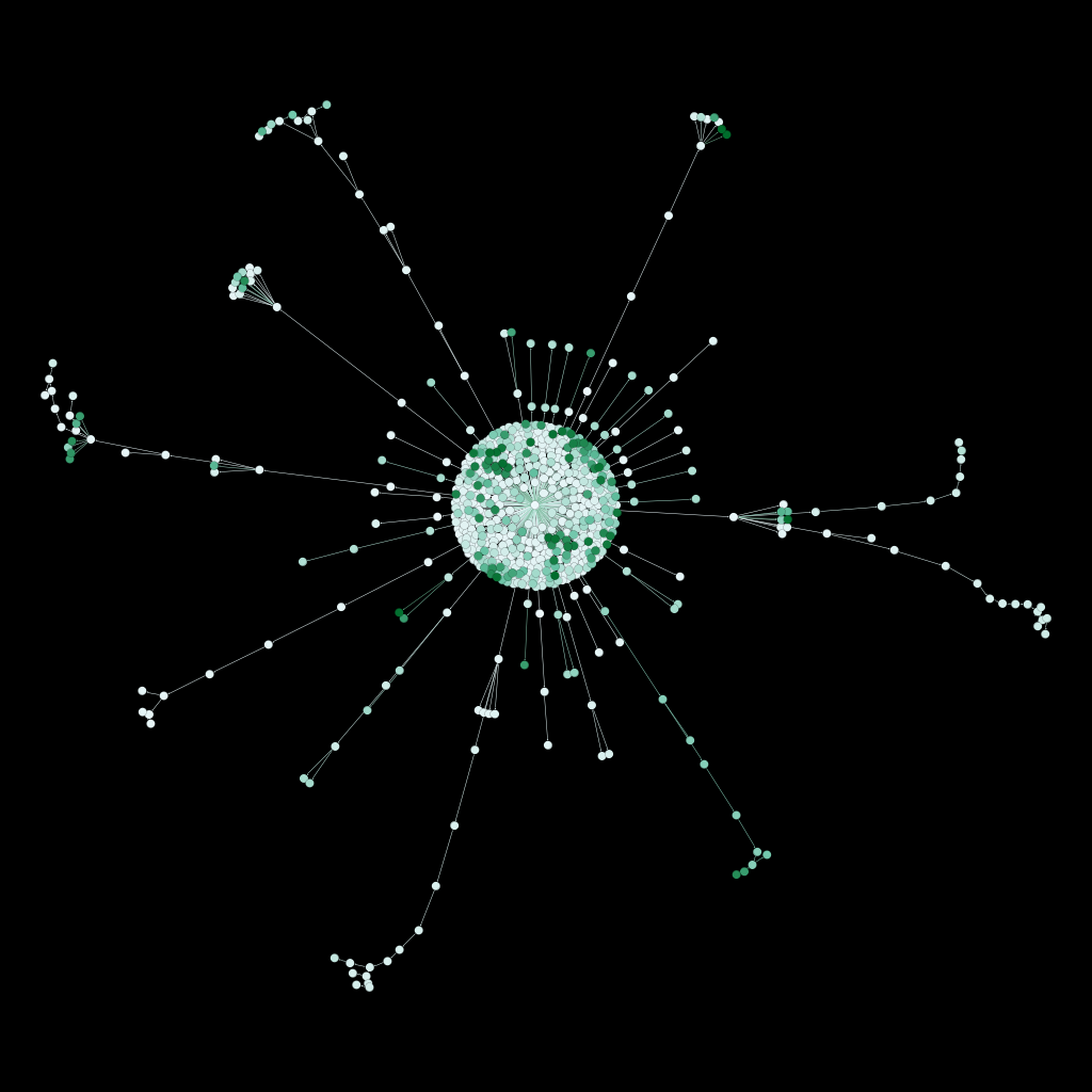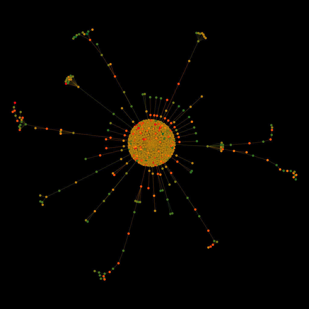 Ils ont produit près de 35% des commentaires sous la publication.représentation graphique de l'arborescence des microfils de discussion où chaque point est un commentaire relié par un segment à celui auquel il répond. Répartis autour de la publication, 33 microfils sont représentés en couleurs fonction de l'identité patriarcale de leur auteur. 5 en orange. 1 à 4 en rouge. 6 à 8 en vert.