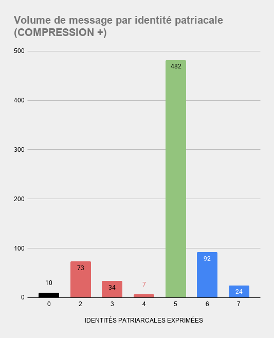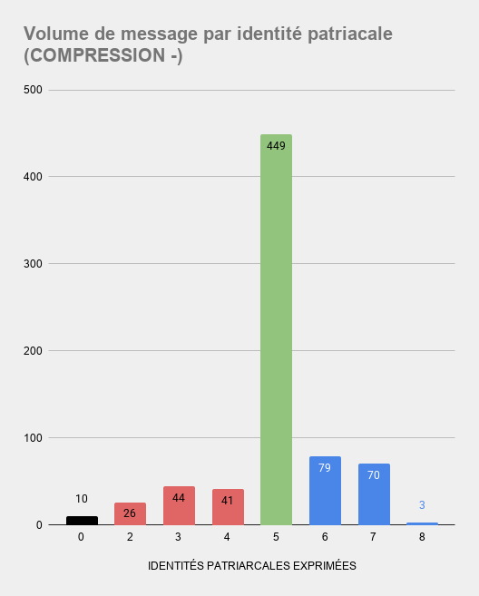 Si on force la polarisation vers des identités plus pro-patriarcales (compression+), les identités anti- et pro-patriarcales représentent alors 116 et 114 commentaires, soit environ 16 % du total des identités exprimées, avec une représentation plus forte des identités réflexives (12.7 %) et réactionnaires (10,1 %). Si on force la polarisation vers des identités plus anti-patriarcales (compression-), les identités anti- et pro-patriarcales représentent alors 111 et 152 commentaires, soit 15,4 % et 21 % du total des identités exprimées. Le spectre de représentativité des identités semble s'être resséré.