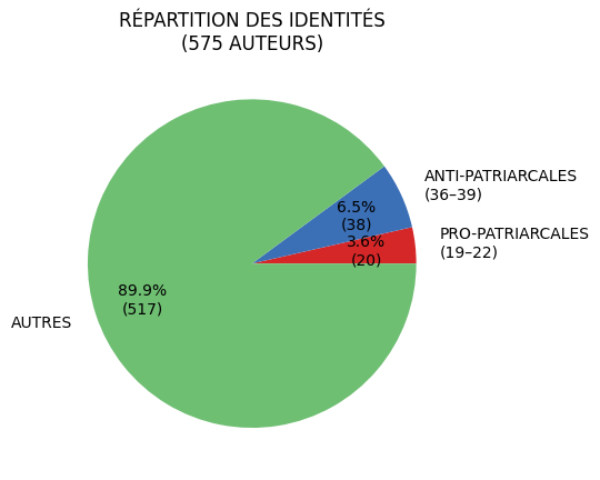 On observe que les identités pro-patriarcales se répartissent sur un spectre plus large que les anti-patriarcales. Elles sont moins compatibles avec la posture défendue par B.S. (25/136 – 18,4 %) que les identités anti-patriarcales (36/152 – 23,7 %)
