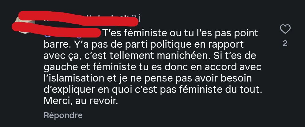 Ceci est un morceau choisi de ce qui circule sur des comptes de femmes — blanches — qui se disent féministes sur les réseaux sociaux — Instagram. Ce commentaire péremptoire prétend à ce que la condition féminine soit universellement calquée sur l'opinion de l'auteur·ice : considérer chaque femme comme une personne à travers sa culture, son vécu, son identité serait une discrimination. Être une femme et ne pas partager cet idéal absolu, systématique qui invisibilise les cultures, les convictions et réduit la question à des sexes sur des corps acculturés, serait une forme de totalitarisme.