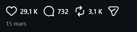 J'ai collecté (10 avril 2026) l'ensemble des commentaires depuis la publication (15 mars 2026). Le nombre de vues de la vidéo n'est pas affiché publiquement mais le nombre de likes, 29 100, et de republications, 3 100, sont eux visibles. 732 commentaires affichés contre 722 téléchargés (variation due à des commentaires modérés/masqués). 6 459 partages par messages et 2 501 enregistrements. On ne peut pas calculer le taux d'engagement de la publication. C'est un ratio commentaire-like à 1/40, commentaire-republication de 1/4, commentaire-partages de 1/9, commentaire-enregistrements de 1/3,5. Tout cela ne nous dit rien de la réception du message.